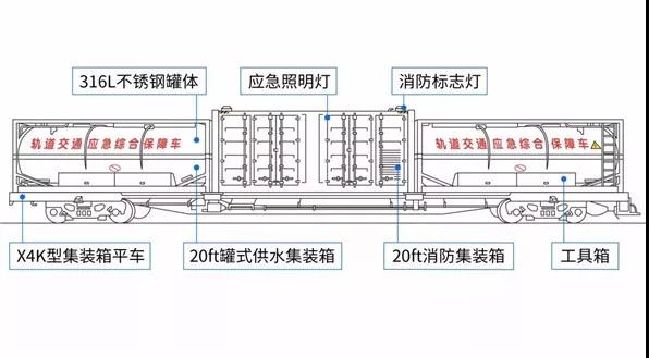 據(jù)介紹,軌道交通應(yīng)急綜合保障車的原型是一輛樸實無華的X4K型集裝箱平車,經(jīng)過加裝改造后配備了多功能高壓噴霧滅火裝置,1個消防集裝箱,2個罐式供水集裝箱,集裝箱總?cè)莘e達(dá)48立方米,還有照明系統(tǒng)、標(biāo)志燈具,警報器、接地裝置、隨車工具等。