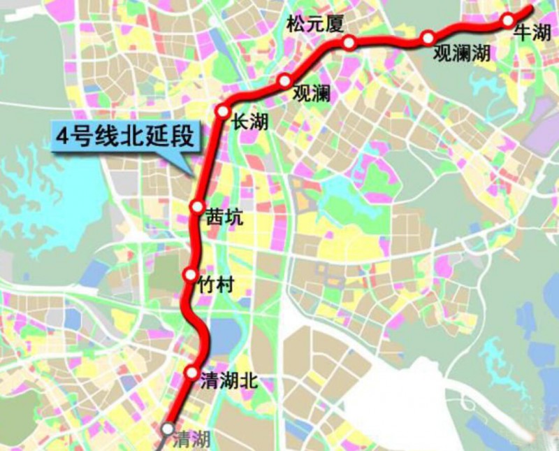 4號線北延線即4號線三期工程,是由清湖站牽出,沿觀瀾大道、高爾夫大道敷設(shè),到達牛湖站。