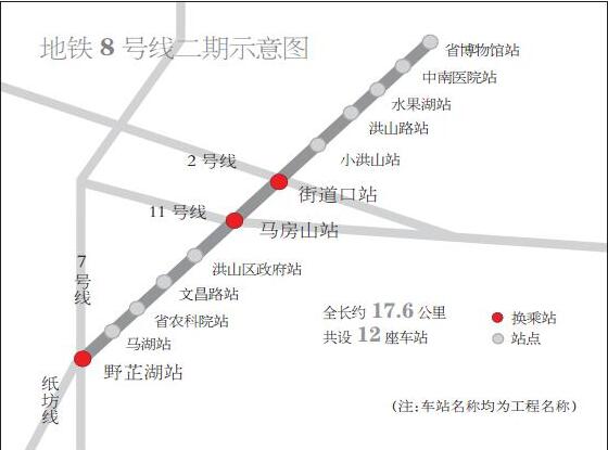 據了解,目前8號線二期工程的馬湖站和小洪山站也進入了主體結構施工階段,其余各站仍在進行圍護結構施工。根據武漢地鐵集團官方網站信息,8號線二期共有3座換乘站,可分別換乘2號線、11號線、7號線和紙坊線。
