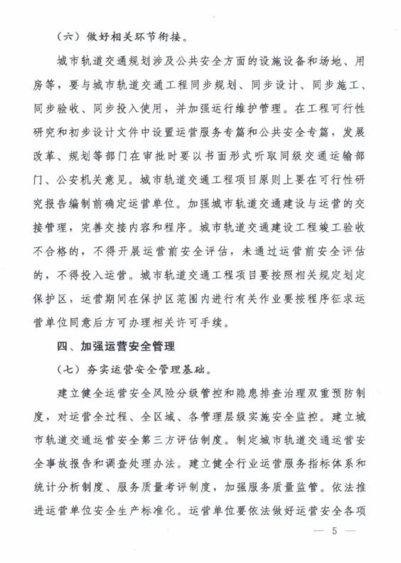城市軌道交通規劃涉及公共安全方面的設施設備和場地、用房等,要與城市軌道交通工程同步規劃、同步設計、同步施工、同步驗收、同步投入使用,并加強運行維護管理。在工程可行性研究和初步設計文件中設置運營服務專篇和公共安全專篇,發展改革、規劃等部門在審批時要以書面形式聽取同級交通運輸門、公安機關意見。城市軌道交通工程項目原則上要在可行性研究報告編制前確定運營單位。