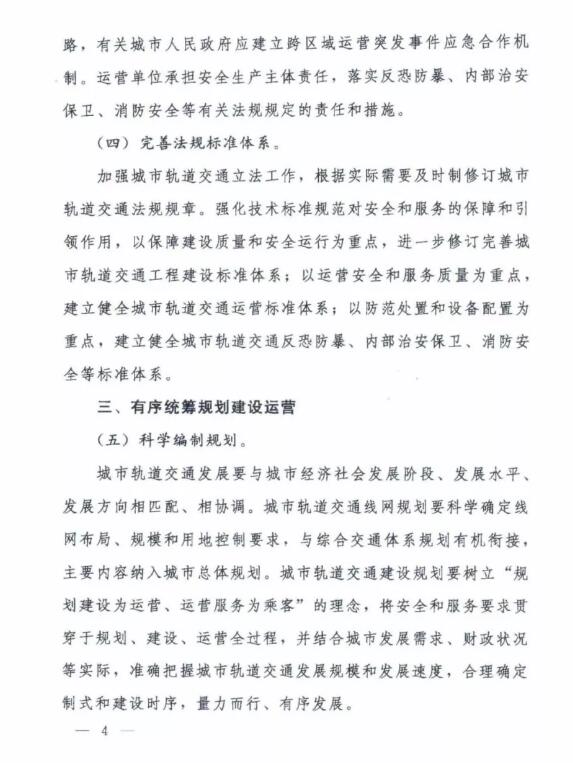 城市軌道交通發展要與城市經濟社會發展階段、發展水平、發展方向相匹配、相協調。城市軌道交通線網規劃要科學確定線網布局、規模和用地控制要求, 與綜合交通體系規劃有機銜接,主要內容納入城市總體規劃。城市軌道交通建設規劃要樹立"規劃建設為運營、運營服務為乘客"的理念,將安全和服務要求貫穿于規劃、建設、運營全過程,并結合城市發展需求、財政狀況等實際,準確把握城市軌道交通發展規模和發展速度,合理確定制式和建設時序,量力而行、有序發展。