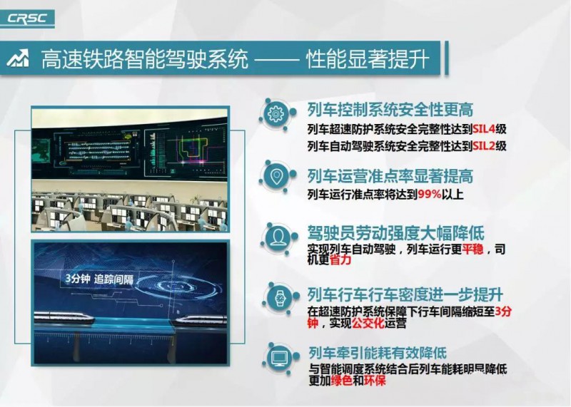 時速300~350公里高鐵列車自動駕駛技術在世界上尚屬空白,研究高速鐵路列車自動駕駛(ATO)技術既是我國高速鐵路技術發展所需,也是確立我國高速鐵路整體技術國際地位的需要。高速鐵路自動駕駛系統構建了具有完全自主知識產權、符合互聯互通標準的高速鐵路自動駕駛技術體系,提升了高速鐵路列車運行控制系統功能。通過運用智能化控制算法和控車策略,實現了對時速350公里高鐵列車的精準控制,全面提升了控車舒適度、停車精準度、節能降耗等性能指標,對減輕司機勞動強度、提高高鐵運營效率、改善旅客乘車體驗具有重要意義。