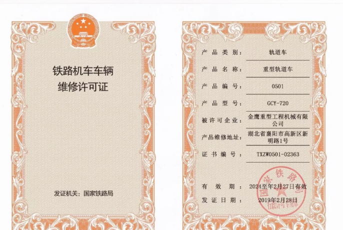 近日,國家鐵路局頒布了新的行政許可公告,金鷹重工喜獲GCY-720型重型軌道車維修許可證書。該證書的獲得標(biāo)志著公司產(chǎn)品大修能力再次獲得國家鐵路局認(rèn)可,公司產(chǎn)品維修資質(zhì)進(jìn)一步完善。截至目前公司共取得維修許可證22個,基本涵蓋鐵路工程機(jī)械行業(yè)主流車型。