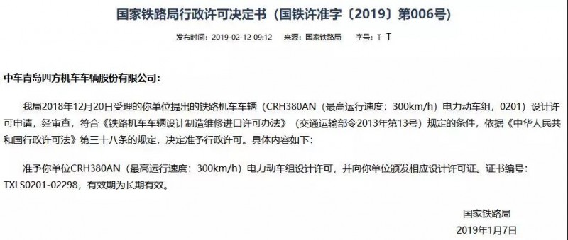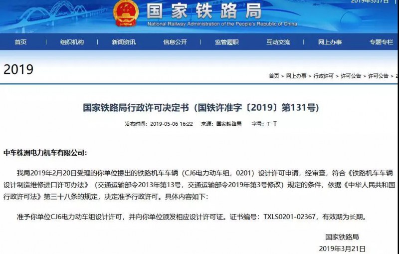 根據國家鐵路局官網5月6日公布的行政許可決定書(國鐵許準字〔2019〕第131/132號),中車株洲電力機車有限公司的CJ6電力動車組已于3月下旬獲頒發設計許可、制造許可雙“準生證”。