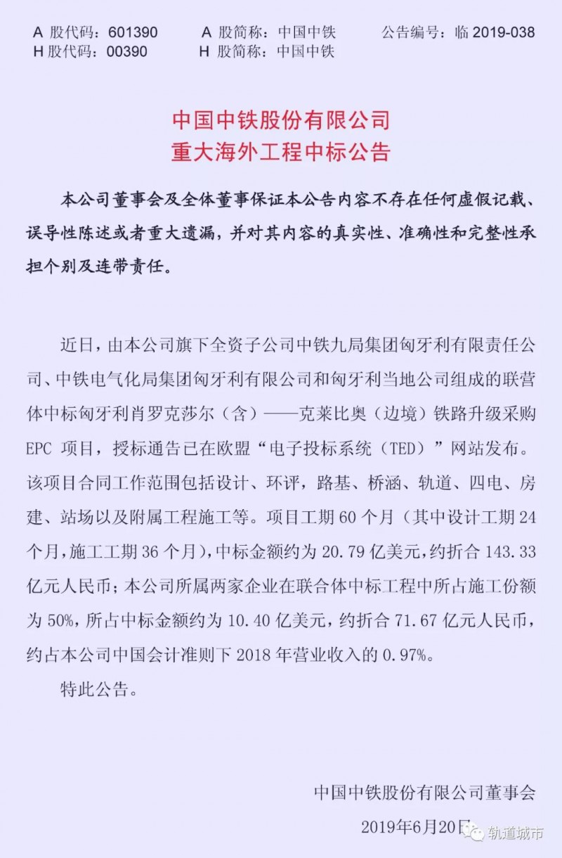 中鐵(601390)6月19日晚間公告,近日,由公司旗下全資子公司中鐵九局集團匈牙利有限責任公司、中鐵電氣化局集團匈牙利有限公司和匈牙利當地公司組成的聯營體中標匈牙利肖羅克莎爾(含)——克萊比奧(邊境)鐵路升級采購EPC項目,中標金額約為20.79億美元,約折合143.33億元人民幣;公司所屬兩家企業在聯合體中標工程中所占施工份額為50%,所占中標金額約折合71.67億元人民幣。授標通告已在歐盟“電子投標系統(TED)”網站發布。