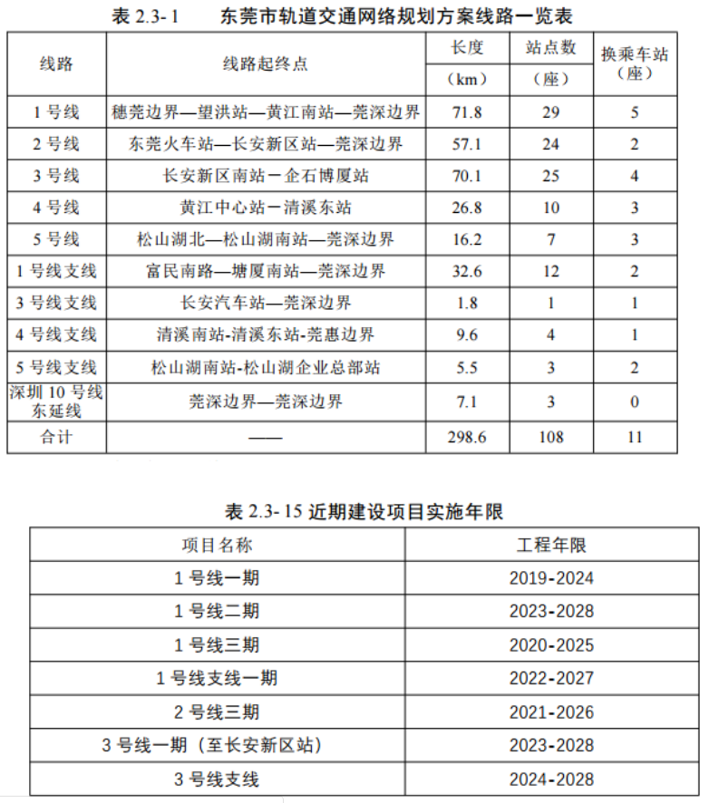 東莞市城市軌道交通規(guī)劃方案由1、2、3、4、5號線5條骨干線路和1號線支線、3號線支線、4號線支線、5號線支線和深圳10號線東延線等5條輔助線路,共計10條線路構(gòu)成,途經(jīng)26個鎮(zhèn)區(qū)。全網(wǎng)總里程298.6km,其中,地上段(含過渡段)19.8km,地下線278.8km。共設(shè)置車站108座,換乘車站11座,其中,高架車站7座,地下車站101座,市域軌道線網(wǎng)密度為0.12km/km2。