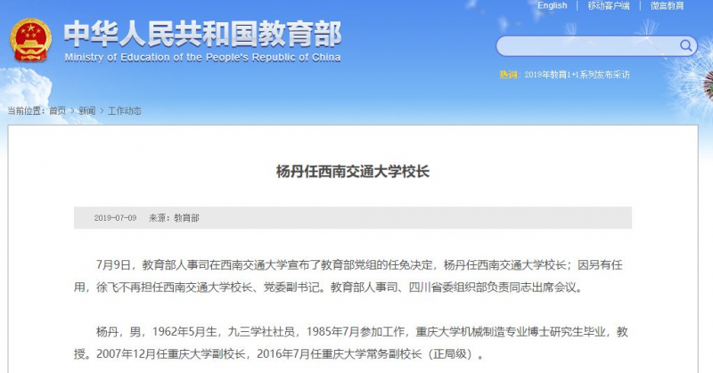 據統計,楊丹是西南交大第66任校長。