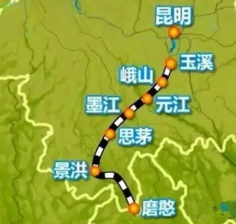 玉磨鐵路是國家《中長期鐵路網規劃》的重要鐵路干線,設計行車速度160公里/小時,站后工程計劃工期28個月,由昆玉鐵路的玉溪站起至中老(撾)邊境磨憨,全長507公里,設13個中間站,從北到南分別為玉溪西站、研和站、峨山站、羅里站、元江站、墨江站、寧洱站、普洱站、勐養站、西雙版納站、橄欖壩站、勐臘站和磨憨站。
