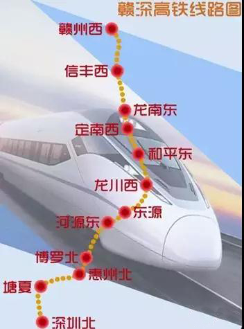 贛深高鐵接入廣深港客運(yùn)專線后,通達(dá)深圳市福田站,繼續(xù)南下接入香港西九龍總站;在贛州西站接駁江西省正在建設(shè)的昌吉贛城際鐵路,再經(jīng)昌九城際鐵路,合安九客運(yùn)專線、合蚌客運(yùn)專線、連接京滬高速鐵路。贛深高鐵作為高速鐵路網(wǎng)“八縱八橫”規(guī)劃中京九高鐵的一段,通車后將成為南北經(jīng)濟(jì)文化交流的重要載體。