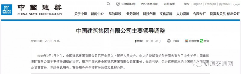 據建筑集團官網消息,9月2日上午,建筑集團有限公司召開中層以上管理人員大會。中央組織部有關負責同志宣布了中央關于建筑集團有限公司主要領導調整的決定:周乃翔同志任建筑集團有限公司董事長、黨組書記;免去官慶同志的建筑集團有限公司董事長、黨組書記職務。有關職務任免按有關法律和章程辦理。